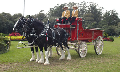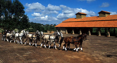 Belos animais da raça Clydesdale frente à carruagem com Claudio Borja, pioneiro na modalidade no país, na condução