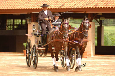 Cavalos lusitanos frente à atrelagem na Fazenda Interagro: criatório pioneiro a investir no modalidade